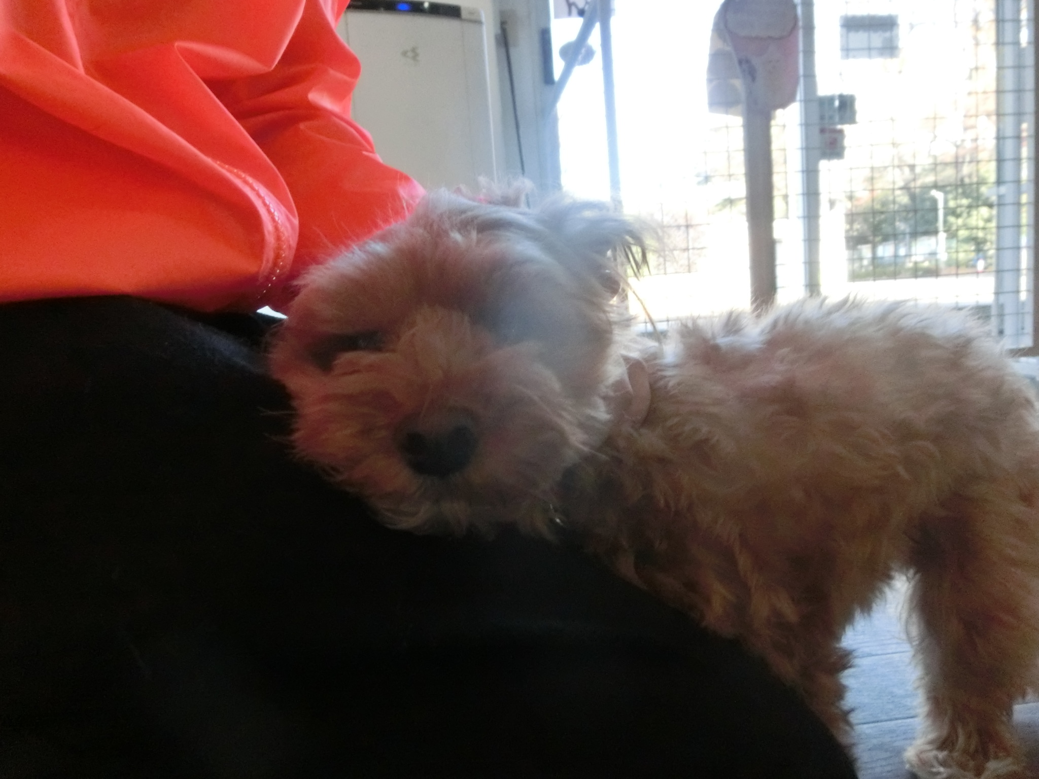 ひざの上に顔をのっけて横になってくつろいでいます(*^^)v